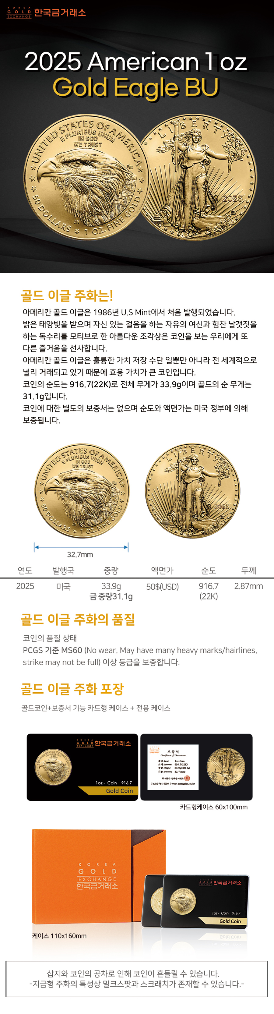2025 1온스 아메리칸 골드 이글 불리온 주화(Coin) 50$(USD) - 22k